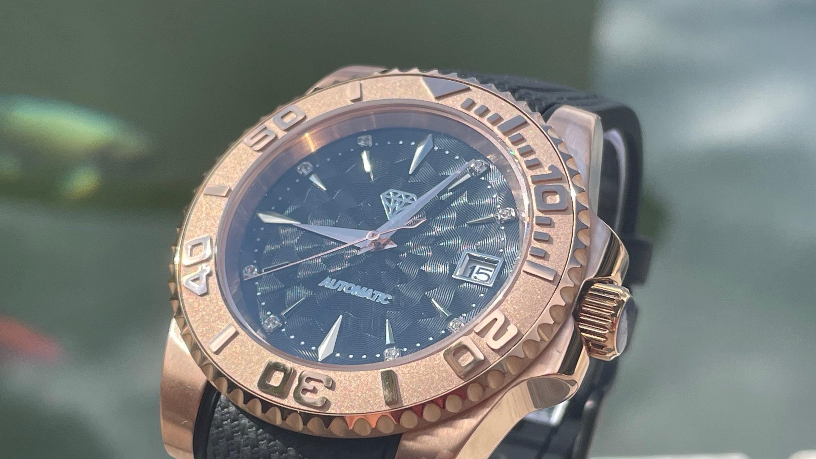 Boîtier en Acier 316L couleur Or Rose de 41mm de diamètre avec lunette rotatif. Durable et résistant à la corrosion.