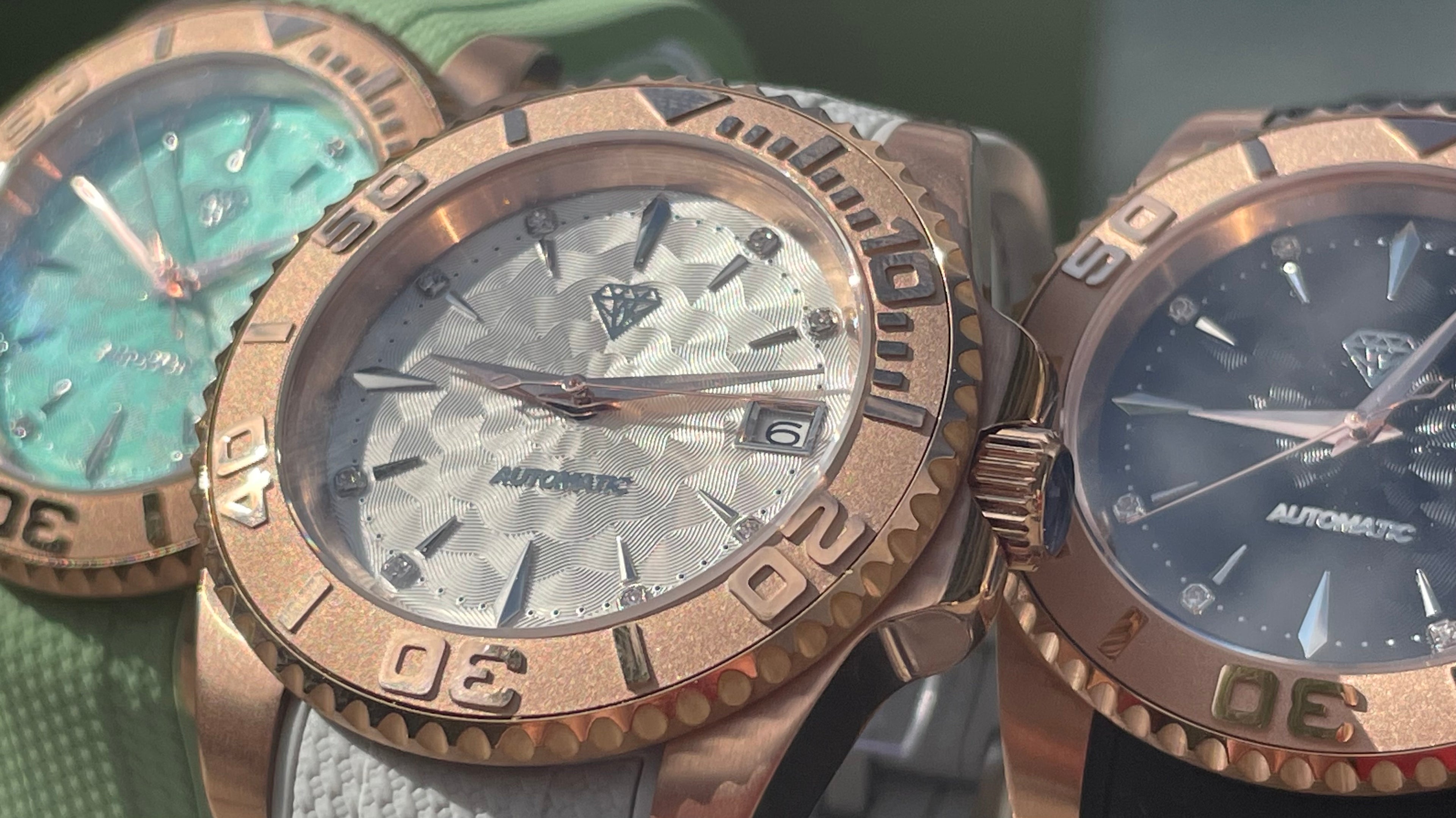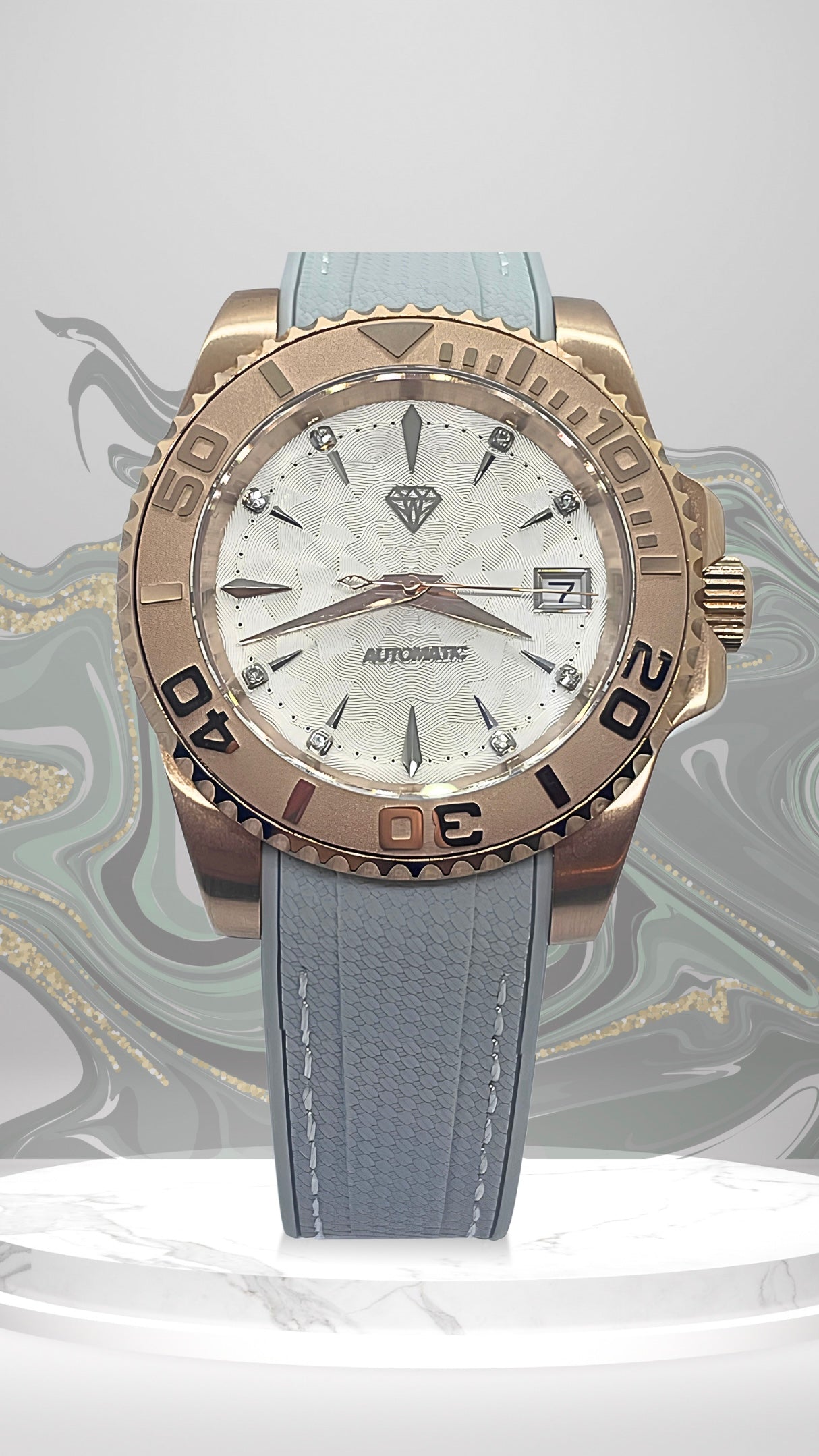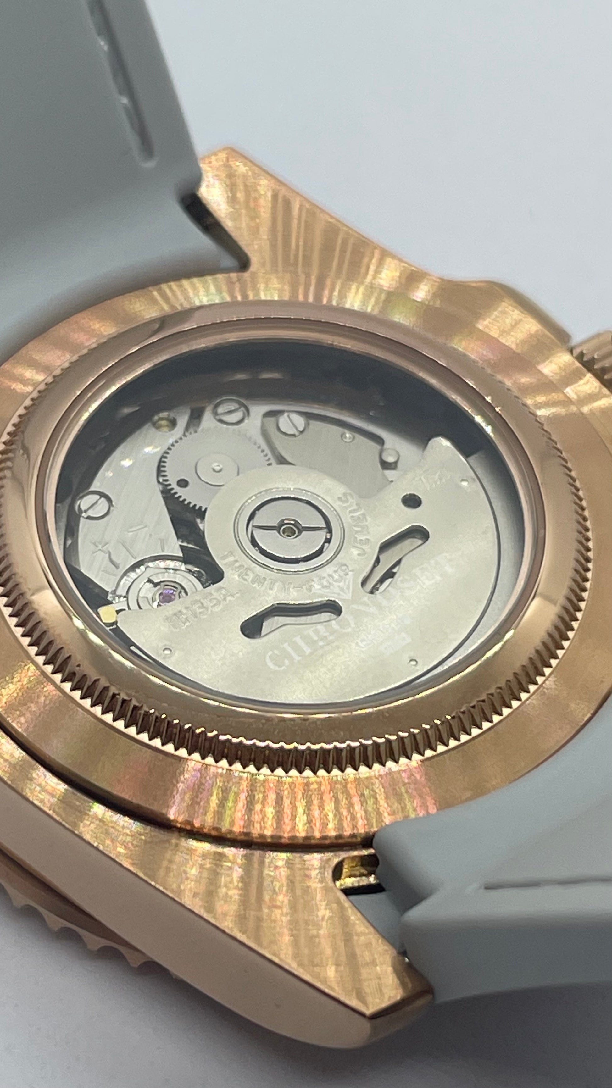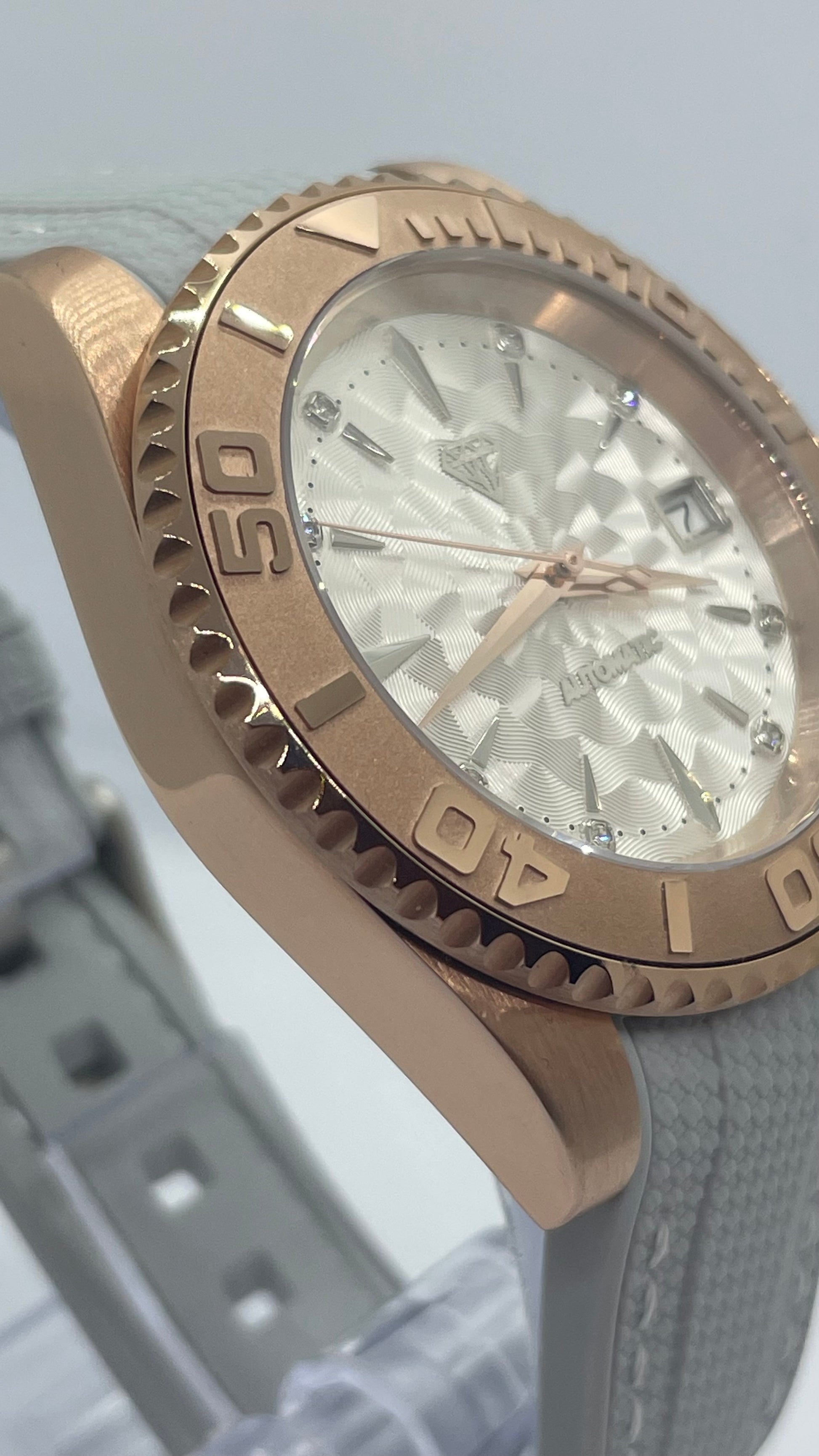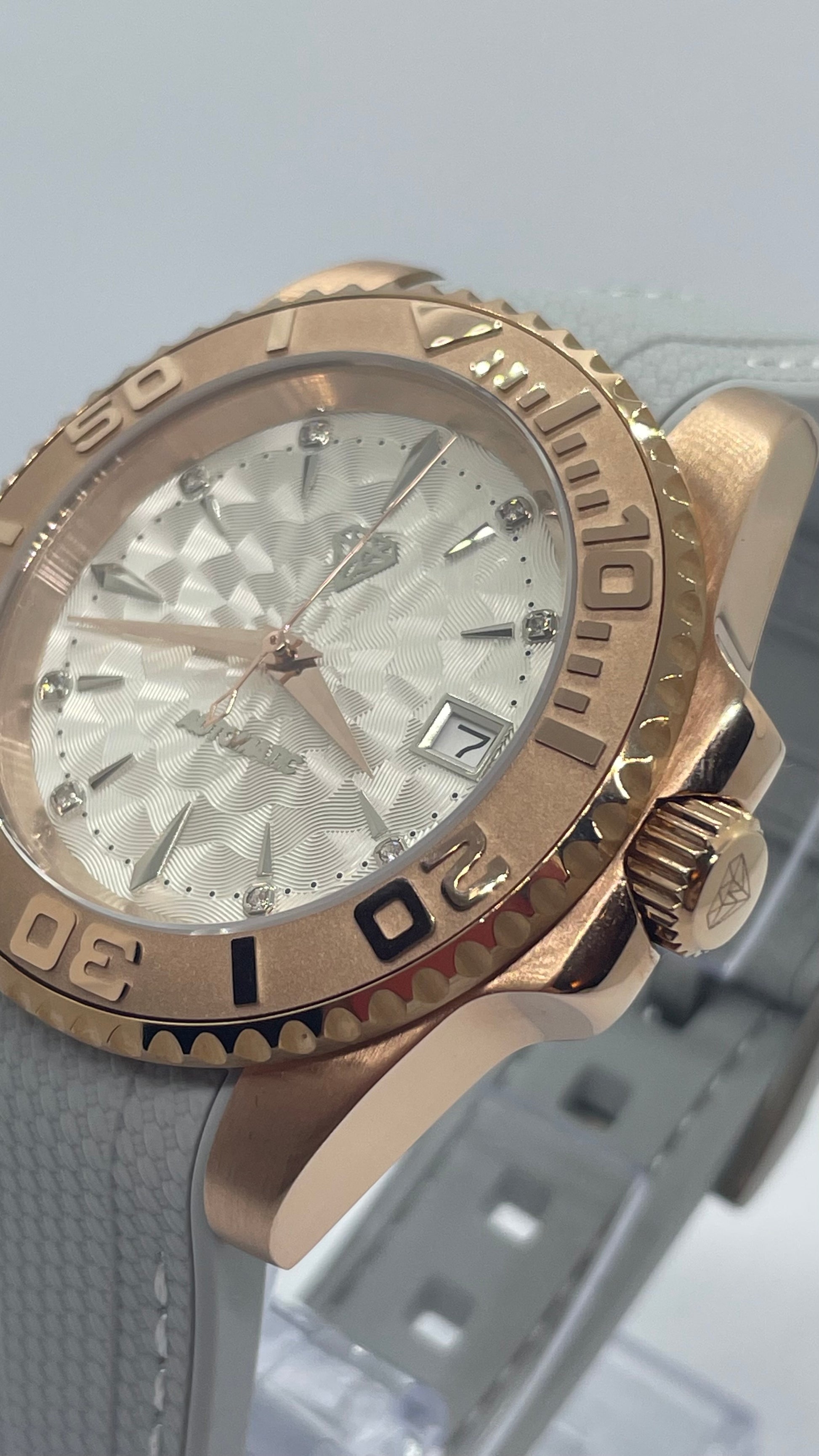 Boîtier en Acier 316L couleur Or Rose de 41mm de diamètre avec lunette rotatif. Durable et résistant à la corrosion.